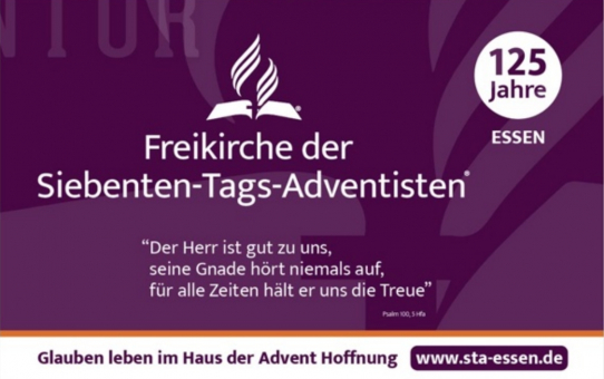 Im Rückblick Unser Gott ist treu Am 17.09.2022 feierten wir das 125-jährige Bestehen der Advent-Gemeinde Essen:Dabei verbrachten wir den gesamten Tag miteinander. Die beiden Festgottesdienste verbanden wir mit einem gemeinsamen Potlick am Mittag. 14:30 Uhr begann der 2. Teil des Festgottesdienstes. Wir erwarteten Gäste von der Stadt Essen sowie von der Vereinigung. Zu einem musikalischen … Festgottesdienst 125 Jahre Adventisten in Essen am 17. September 2022 weiterlesen