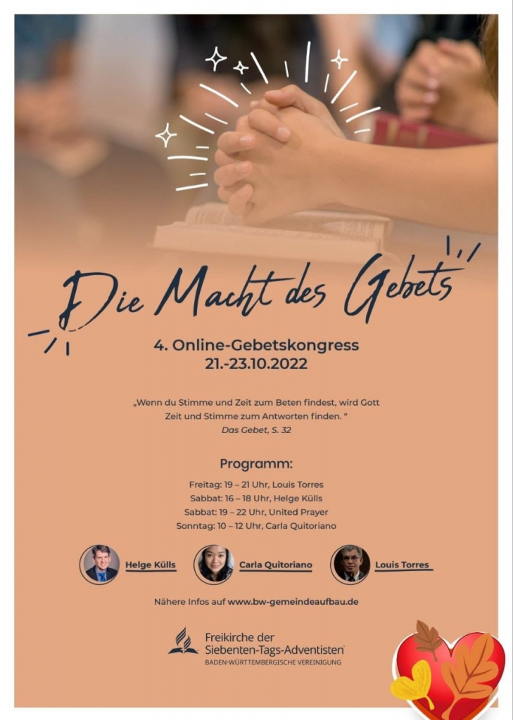 1. November 202211. November 2022 am Die Macht des Gebets Der 4te online Gebetskongress vom 21.10 bis 23.10. war ein sehr gesegnetes Event. Gott möge alle segnen, die dabei waren und auch dich um die Aufzeichnungen der Sprecher anzuschauen. https://bw-gemeindeaufbau.de/die-macht-des-gebets/ Gefällt mir:Gefällt mir Wird geladen … Ähnliche Beiträge Post navigation ← Gottesdienst am 29.10.2022 Taufpredigt mit Dario Paeper Die Sabbat-Verschwörung →