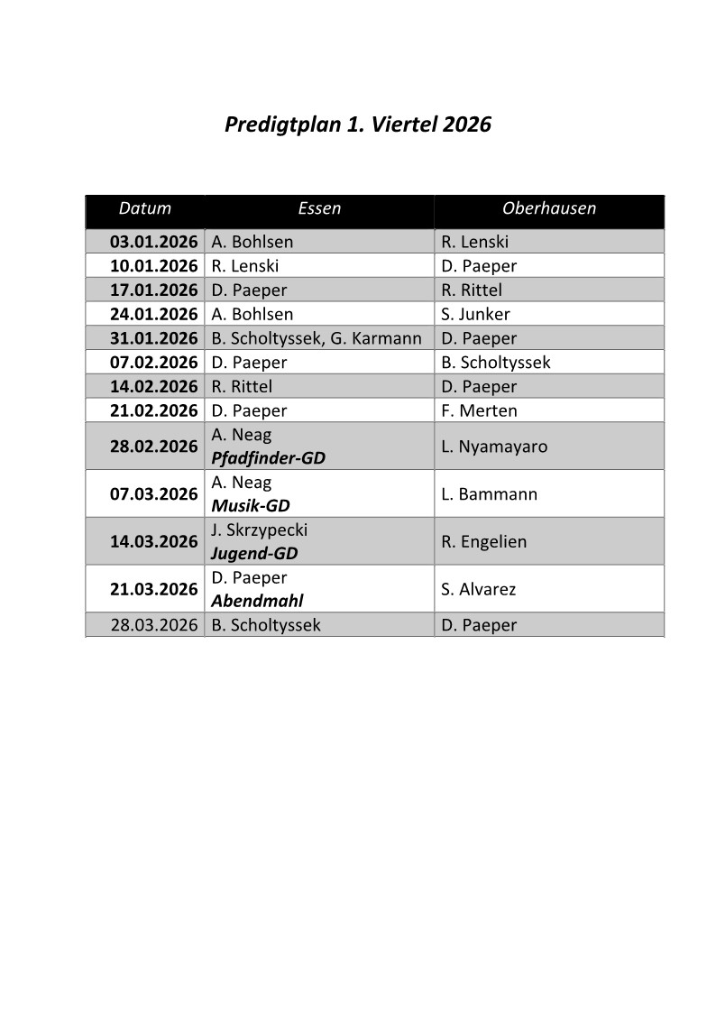 19. Januar 20266. Februar 2026 am zurück zu den Bekanntmachungen – „Auf einem Blick“ Gefällt mir:Gefällt mir Wird geladen … Ähnliche Beiträge Post navigation ← „Vergesslichkeit, vergessen“ Gottesdienst mit Ralf Lenski am 10 Januar 2026 „Kraft – Liebe – Besonnenheit“ Gottesdienst mit Dario Paeper am 17 Januar 2026 →