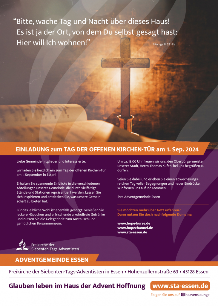26. Juli 202426. Juli 2024 am #Einladung „Wir öffnen unsere Türen“ #SO 01. September 2024 – ab 11 Uhr Themen #Gottesdienst #Diakonie #Kinderdiakonie #Gesundheit #Pfadfinderarbeit #Charity #Frauenarbeit #Bücher und mehr Gefällt mir:Gefällt mir Wird geladen … Ähnliche Beiträge Post navigation ← „Mächte, Kraft & Sieg“ Gottesdienst mit Ralf Rittel am 20. Juli 2024 „Hoffnung ist mehr als ein Wort“ Gottesdienst mit Dario Paeper am 27. Juli 2024 →